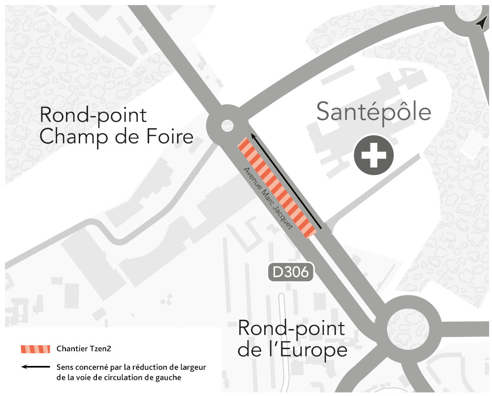 À partir du lundi 17 novembre et jusqu’à la fin du mois de février 2026, des travaux auront lieu sur le terre-plein central de la RD 306 (avenue Marc Jacquet), entre le carrefour du Santépôle (Hôpital) et le rond-point du Champ de Foire.